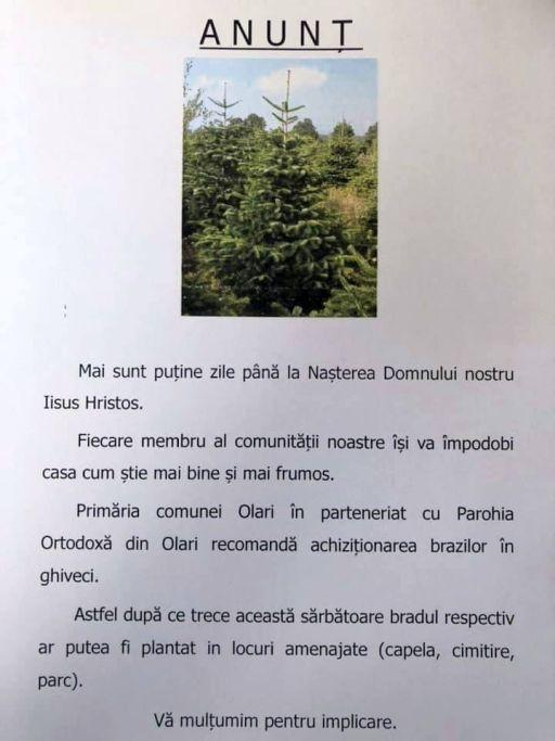 "Mai sunt puţine zile până la Naşterea Domnului Nostru Iisus Hristos. Fiecare membru al comunităţii noastre îşi va împodobi casa cum ştie mai bine şi mai frumos. Primăria Comunei Olari în parteneriat cu Parohia Ortodoxă din Olari recomandă achiziţionarea brazilor în ghiveci. Astfel, după ce trece această sărbătoare, bradul respectiv ar putea fi plantat în locuri amenajate (capelă, cimitire, parc etc.). Vă mulţumim pentru implicare", se arată în apel.