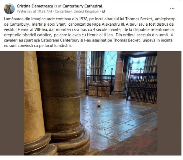 Altarul sau a fost distrus de vestitul Henric al VIII-lea, dar moartea i s-a tras cu 4 secole inainte, de la disputele referitoare la drepturile bisericii catolice, pe care le avea cu Henric al II-lea. Din ordinul acestuia din urmă, 4 cavaleri au spart ușa Catedralei Canterbury și l-au asasinat pe Thomas Becket, undeva în incintă, nu sunt convinsă că pe locul lumânării", a scris Cristina Demetrescu pe pagina sa de Facebook.