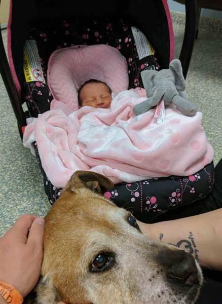 Când bebelușul Hazel a ajuns acasă, Rocky a început să îl miroase și să-și pună capul lângă el.