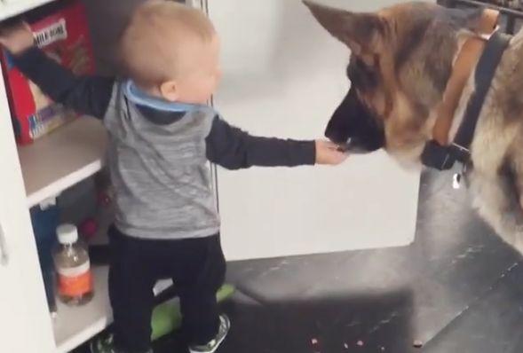 Micuțul său intrase aproape cu totul în dulapul unde se afla mâncarea pentru câine și scotea câte un biscuit pentru a-l oferi patrupedului casei, un ciobănesc german.