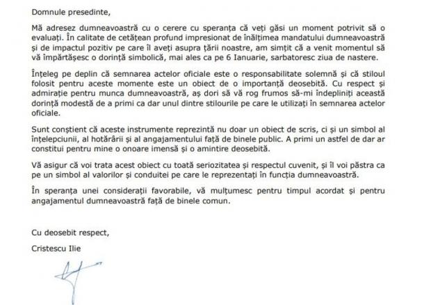 "Am simțit că a venit momentul să vă împărtășesc o dorință simbolică, mai ales că pe 6 ianuarie, sărbătoresc ziua de naștere. Înțeleg pe deplin că semnarea actelor oficiale este o responsabilitate solemnă și că stiloul folosit pentru aceste momente este un obiect de o importanță deosebită. Cu respect și admirație pentru munca dumneavoastră, aș dori să vă rog frumos să-mi îndepliniți această dorință modestă de a primi ca dar unul dintre stilourile pe care le utilizați în semnarea actelor oficiale".