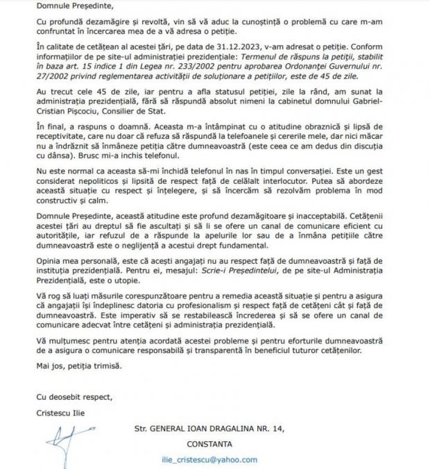 După 45 de zile, când a văzut că nu primește niciun răspuns de la Administrația Prezidențială, bărbatul a revenit cu o scrisoare.