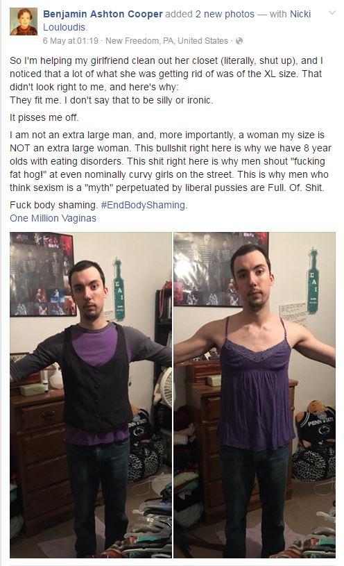 Benjamin Ashton Cooper își ajuta iubita să își facă curățenie în dulap, când a remarcat că mai toate hainele ei erau etichetate cu măsura XL.