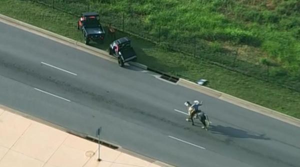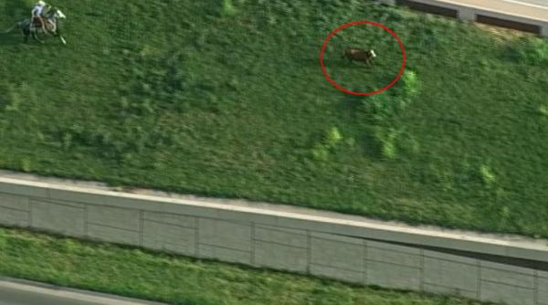 Imagini surprinse din elicopter și viralizate pe rețelele sociale arată cum animalul reușește o bună bucată de vreme să evite să fie capturat de bărbați călare, asistați de membri ai echipajelor de urgență mobilizate la fața locului.
