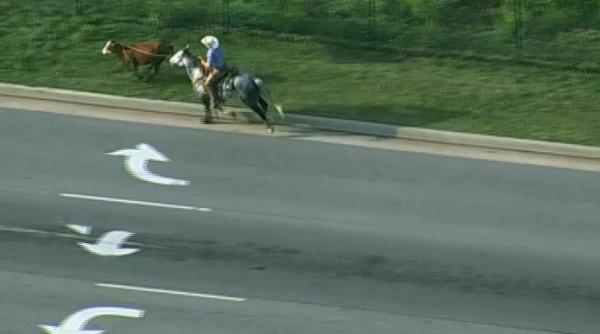 Presa americană relatează că vaca a scăpat, probabil, dintr-o remorcă al cărei sistem de închidere s-a defectat.