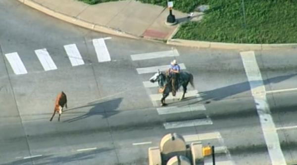 O vacă aparent fascinată de gustul libertății tranzita în viteză autostrada interstatală 40, în apropierea bulevardului Pennsylvania, cu o cohortă de urmăritori în spatele ei.