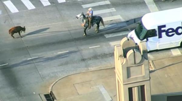 Vaca aleargă în continuare spre o intersecție și încercă să scape de frânghie, dar experimentatul cowboy și calul său rămân fermi pe poziție.