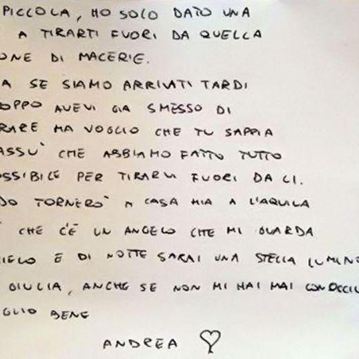„Regret nespus că am ajuns la voi atât de târziu. În acel moment tu nu mai respirai, însă vreau să știi că am făcut tot posibilul ca să vă salvăm. Acum, când mă întorc acasă, știu că mă privește un Înger. Adio, Giulia! Te iubesc, chiar dacă tu nu mai poți afla acest lucru. Andrea.”