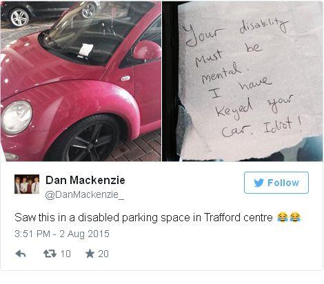 "Handicapul tău trebuie să fie unul mintal. Ţi-am zgâriat maşina, idiotule!", este mesajul cu care a fost întâmpinat şoferul acestui Volkswagen Beetle vişiniu, parcat pe un loc pentru persoanele cu handicap, din apropierea Trafford Centre, din Manchester.