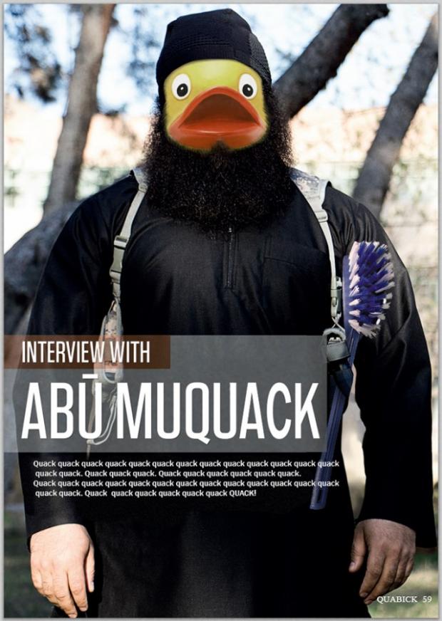 O metodă inedită de discreditare a teroriştilor capătă amploare pe internet. Fotografii ale jihadiştilor au fost modificate, iar luptătorii Stat Islamic au fost transformaţi în răţuşte galbene de cauciuc. În plus, armele automate au fost înlocuite cu perii.