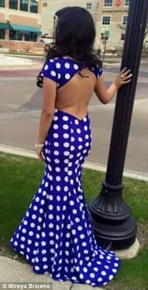Mireya era incantata de rochia ei albastra cu buline albe, lunga pana la podea, pe care platise 300 de dolari. Desi avea zonele laterale descoperite, abdomenul nu era vizibil, ceea ce era in concordanta cu regulamentul scolii. De asemenea lungimea era peste cea minima acceptata de profesori. Singura zona descoperita era spatele.