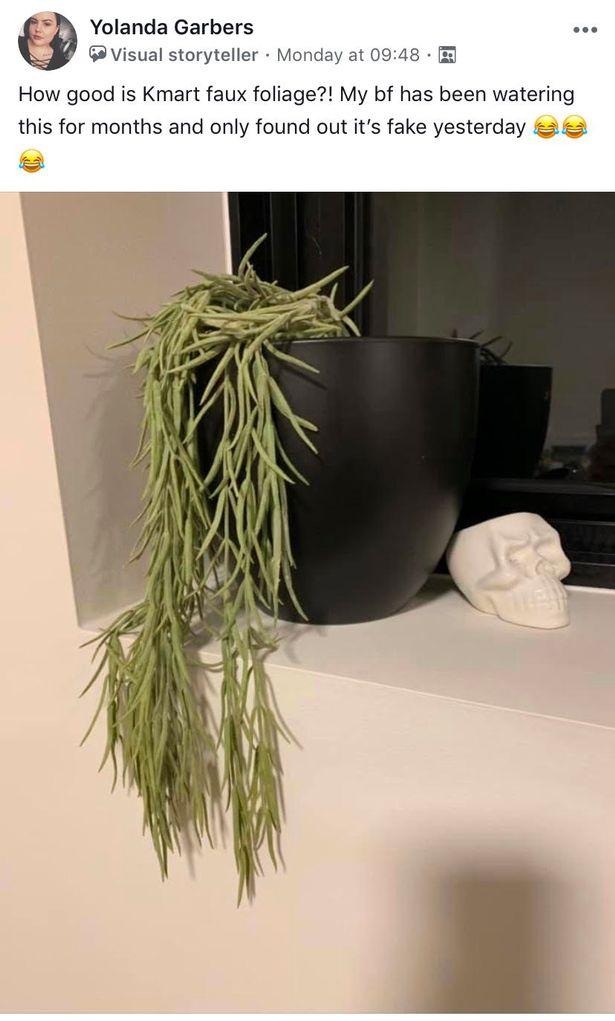 Incidentul a fost povestit chiar de iubita lui pe grupul Kmart Home Decor & Hacks: „Cât de tare este planta falsă de la Kmart. Iubitul meu o uda de luni întregi. Ieri a aflat că este de plastic”, a scris tânăra.