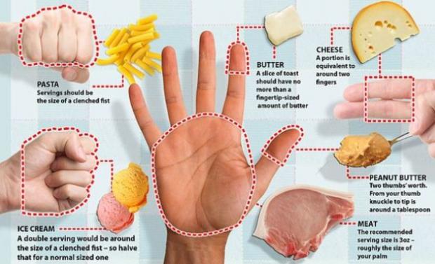 O porţie de friptură ar trebui să fie cât podul palmei. Poţi consuma atâtea legume verzi la o masă cât încap în două mâini întinse.