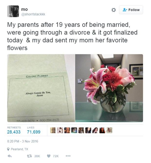 Săptămâna trecută, după 19 ani de casnicie, părinții lui Morgan Lynn au divorțat. Imediat după finalizarea divorțului, tatăl tinerei, Jason, i-a trimis fostei sale partenere de viață un buchet superb de flori. Era florile ei preferate. Alături de ele, bărbatul atașase un bilet: „Voi fi mereu alături de tine!”