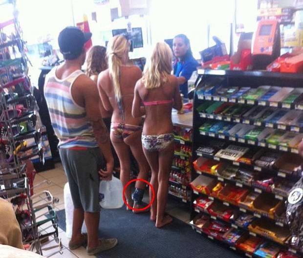 O fotografie surprinsa intr-un supermarket din SUA a devenit imediat virala, dupa ce a reusit sa starneasca curiozitatea internautilor. Daca la prima vedere punctul de interes al imaginii se invarte in jurul celor 3 fete, care asteapta, in costum de baie, la casa de marcat, un alt detaliu era de fapt important.