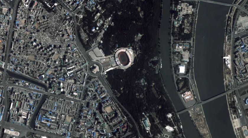 Ținând cont că orașul are 3,2 milioane de locuitori, se poate observa că traficul este extrem de redus. De asemenea, se pot observa câteva dintre cele mai reprezentative clădiri ale orașului, Palatul Soarelui sau Stadionul Kim Il-Sung.