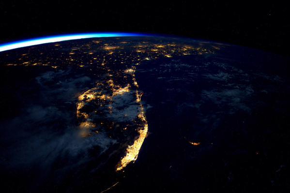 "Ziua mea începe în timp ce America încă doarme. Noapte bună de pe Staţia Spaţială", a scris Scott Kelly, pe Twitter, alăturând imaginea de mai jos.