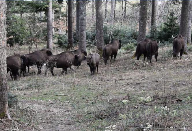 O turmă de 14 zimbri, adulţi şi viţei de anul trecut, a fost filmată în Parcul Natural Vânători Neamţ, singurul loc din Europa în care există zimbri în libertate.