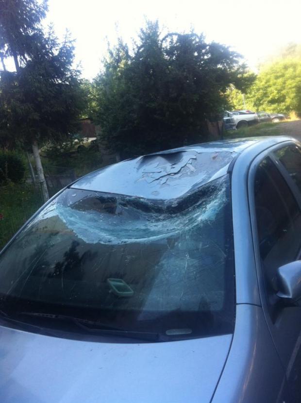 O maşină parcată în faţa unui bloc din Cluj-Napoca a fost serios avariată. Cauza? Un “pepene zburător”, scrie citynews.ro. Plafonul autoturismului, dar şi parbrizul au fost distruse de “ghiulea”. Lângă autoturism, bucăţi de pepene roșu.