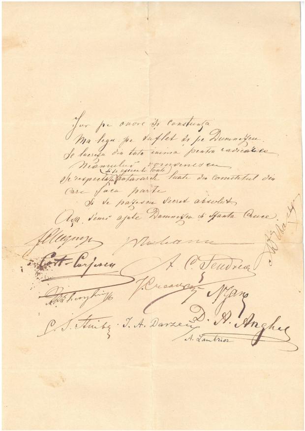 Iată şi textul-jurământ semnat de nume importante precum N. Culianu, N. Gane, A. Lambrior, I. Creangă, cărora se adaugă A.C. Şendrea, I.A. Darzeu, C. Corjescu, D.A. Anghel şI alţii. “Jur pe onoare şi conştiinţă. Mă leg pe suflet şi pe Dumnezeu/ Să lucrez din toată inima pentru ridicarea neamului românesc/ Să respect şi să execut toate hotărârile luate de comitetul din care face parte. Şi să păzesc secret absolut./ Aşa să-mi ajute Dumnezeu şi sfânta Cruce”.