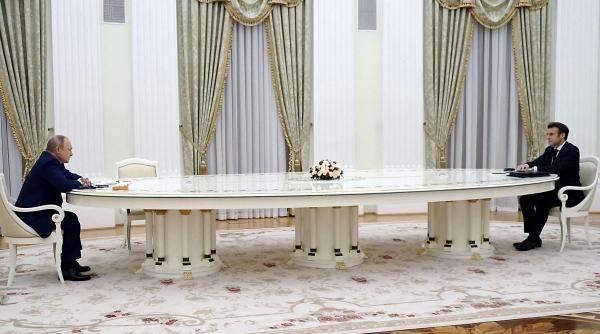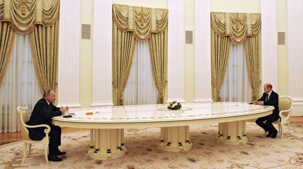 Drept consecință, atât Macron cât și Scholz au fost puși în capătul celebrei - de-acum - mese lungi, la șase metri de Vladimir Putin.