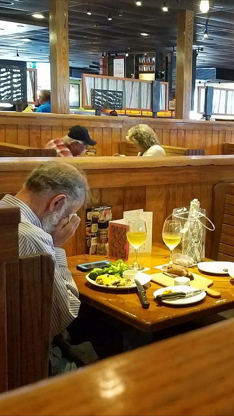 Se dusese să ia masa la restaurant singură chiar de Ziua Îndrăgostiților, când a zărit alături un bătrân fără companie. Când s-a uitat pe masa lui, a observat că avea două pahare de vin, o farfurie, dar...și cenușa femeii iubite.