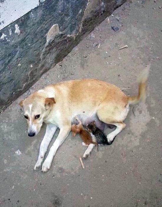 O cățea maidaneză a fost fotografiată în timp ce alăpta doi pui de pisică, într-un colț de stradă.
