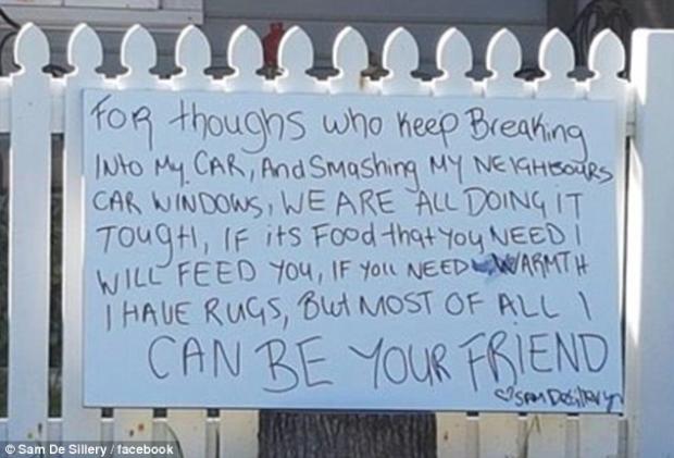 "Pentru cei care mi-au spart maşina şi care au spart geamurile maşinilor vecinilor mei: tuturor ne este greu. Dar dacă faceţi asta pentru că aveţi nevoie de mâncare, eu vă voi hrăni; dacă aveţi nevoie să vă încălziţi, vă pot oferi pături, dar, cel mai important, pot fi prietena voastră", a scris Sam de Sillery, într-un mesaj agățat de gard.