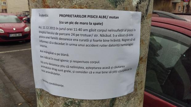 Un anunţ lipit pe un stâlp din Cluj-Napoca a emoţionat iubitorii de animale. Deşi anunţul este unul trist, faptul că persoana care l-a lipit a făcut acest gest a stârnit reacţii pozitive în rândul celor care au văzut fotografia postată şi distribuită pe reţelele de socializare.