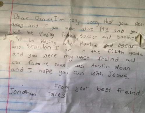 "Îmi pare foarte rău că ai murit. Dacă ai fost în viață ne-am fi jucat fotbal și baschet cu Matei, Oscar și Brandon. Ai fost cel mai bun prieten al meu”, a scris Jonathan în bilețelul său din sticlă.