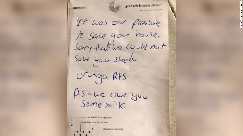 “A fost o plăcere pentru noi să-ți salvăm locuința. Ne pare rău că nu am putut să-ți salvăm șopronul. P.S. Ți-am rămas datori cu niște lapte”, scrie CNN.