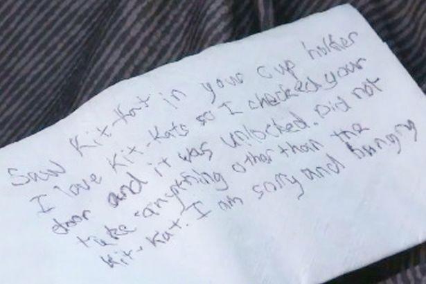 Tânărul susține că și-a lăsat mașina în fața unui cămin studențesc pentru 15 minute, iar când s-a întors a găsit un bilet în care hoțul i-a scris că a văzut o ciocolată la el în mașină și că ”a trebuit” să o ia pentru că îi era foame și pentru că ”iubește Kit Kat”.
