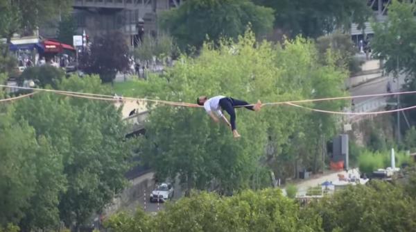 Paulin a parcurs în aproximativ o jumătate de oră o distanță de 670 de metri, pe o coardă suspendată la 70 de metri deasupra solului.