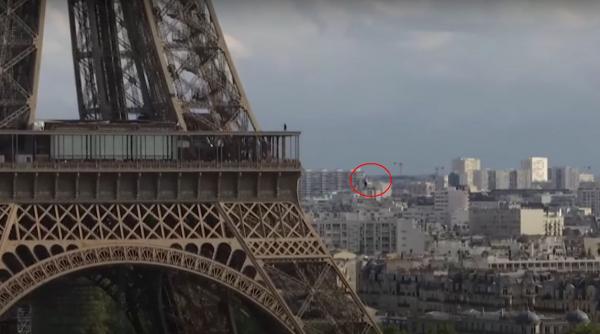 La un moment dat, Paulin s-a așezat și s-a întins pe coardă, înainte de a ajunge la Teatrul Chaillot, punctul final al acrobației sale.