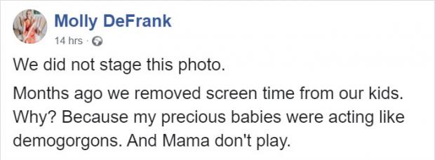 ”Nu, această poză nu a fost aranjată. În urmă cu câteva luni am eliminat timpul petrecut în fața ecranelor de către copiii noștri. De ce? Pentru că scumpii mei copii se transformaseră în mici demoni. Și mamei nu îi place”, a scris femeia.