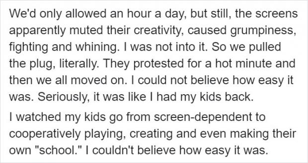 ”Le permiteam doar o oră pe zi, însă și așa era mult și le afecta creativitatea, deveniseră mai obraznici și aveau des crize de plâns”, mai spune femeia.