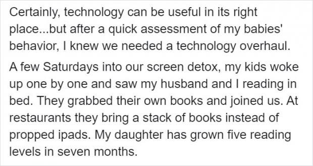În postarea ei, Molly notează că fiica ei a început să citească mai bine, de când a renunțat complet la tehnologie.
