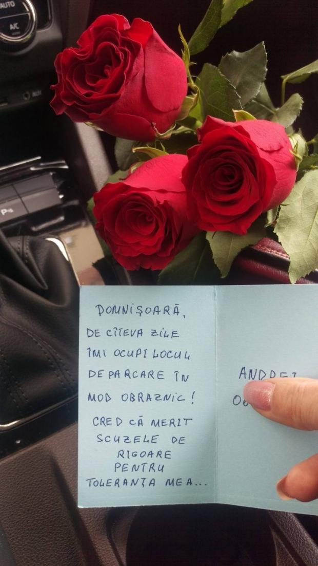 În mesajul pe care l-a lăsat un bărbat pe nume Andrei, că domnișoara îi ocupă, "în mod obraznic" locul de parcare de mai mult timp și că "merit scuzele de rigoare pentru toleranța mea".