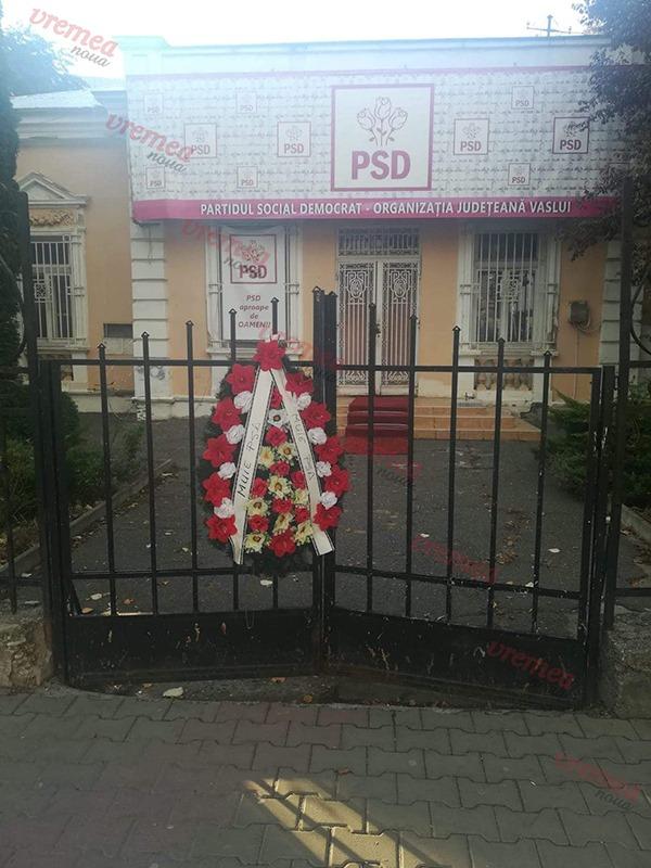 Vasluienii au întâmpinat cum se cuvine căderea Guvernului Dăncilă, prin votul din Parlament la moțiunea de cenzură, și au adus la sediul PSD o coroană de flori pe care au agățat-o de gardul instituției.