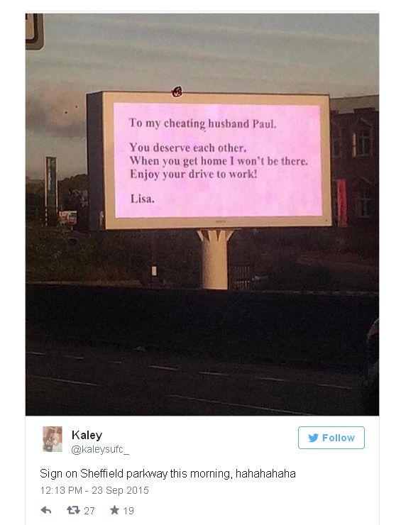 O femeie din Marea Britanie a găsit o metodă neobişnuită de a se răzbuna pe soţul ei, care o înşelase: i-a transmis bărbatuluii un mesaj pe un panou publicitar, montat într-o zonă cu trafic intens.