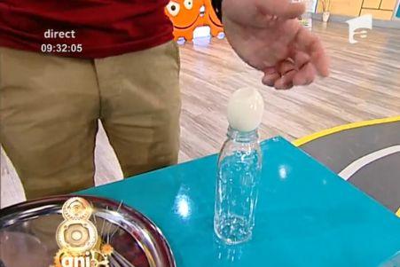 Cei doi încearcă să demonstreze cum poate fi băgat un ou într-o sticlă.