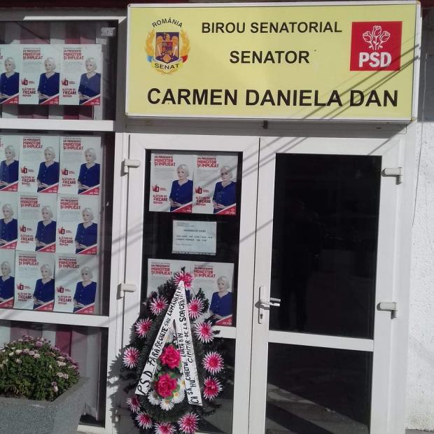 Eșecul PSD de la alegerile prezidențiale a fost prilej de bucurie la Roșiorii de Vede, în Teleorman. În fața cabinetului senatorial al lui Carmen Dan, fost ministru de Interne, a apărut o coroană funerară, a notat liberinteleorman.ro.