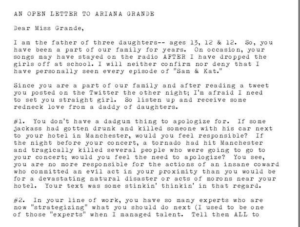 Acum, un bărbat din Georgia, SUA, tatăl a trei fetițe care îi ascultă muzica Arianei Grande, i-a scris artistei o scrisoare îi care o sfătuiește să își ia timp să își revină din această tragedie și să revină pe scenă când va fi pregătită să facă asta, căci ”fanii tăi nu pleacă nicăieri”, iar ”muzica este limba internațională a păcii”, scrie Mirror.