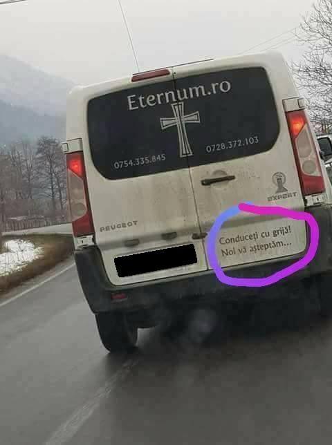 Pe autoturism era scris un îndemn de a conduce cu grijă, alături de un mesaj nostim și bun de reclamă: „Noi vă așteptăm...”.
