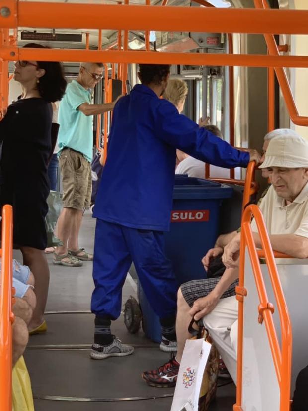 Un jurnalist a imortalizat momentul și a postat pe Facebook, alături de mesajul: „Nu mai sunt bani de mașini de gunoi care să umple străzile de zeamă împuțită? Nicio problemă, umplem tramvaiele!”