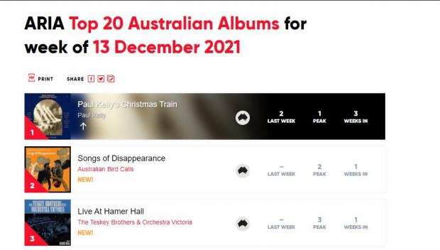 Intitulat "Cântecele dispariției" (Songs of Disappearance), albumul cu triluri, țipete și ciripit de păsări depășește creațiile unor artiști precum Abba și The Weeknd, fără a-i pomeni pe favoriții internaționali ai perioadei Crăciunului, Michael Buble și Mariah Carey.