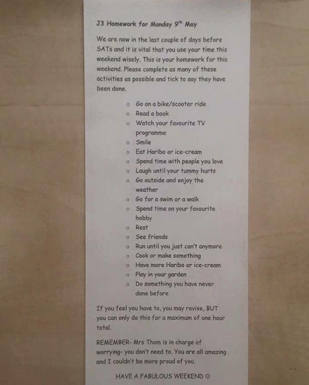 Aflați în pragul unor examene importante pentru viitorul lor școlar, elevii sunt rugați de învățătoare să se relaxeze și să petreacă timpul la televizor sau alături de familie și prieteni și, eventual, să repete materia doar dacă simt nevoia, dar nu mai mult de o oră, scrie Mashable.
