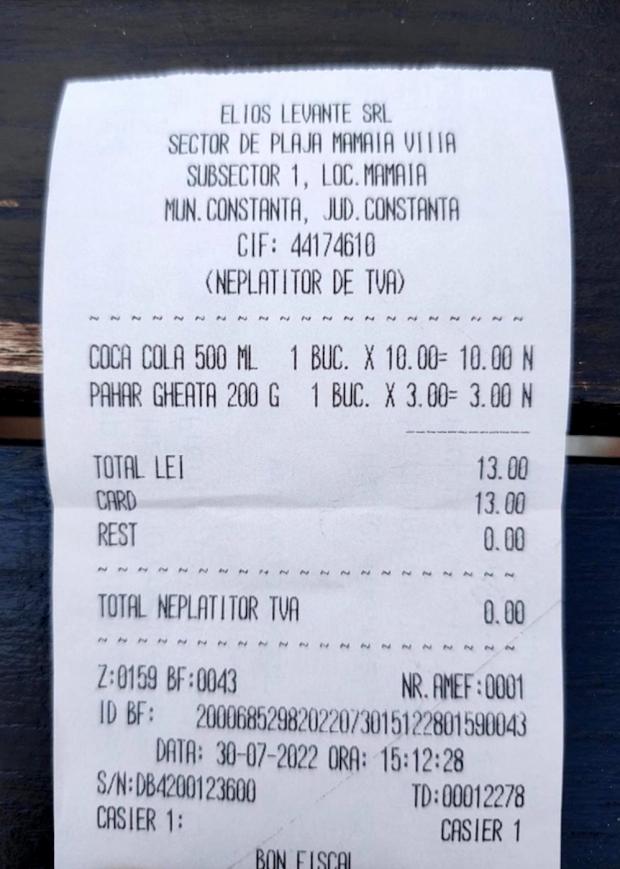La sfârșitul săptămânii trecute, pe rețelele sociale au apărut fotografii cu bonuri fiscale de la un bar din Mamaia care a luat bani clienților inclusiv pentru gheața din pahar.