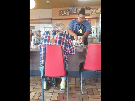 Mai precis, tânăra Evoni Williams din Houston avea un client în vârstă cu probleme de sănătate. Omului îi tremurau mâinile și nu reușea să își taie bucata de carne din farfurie. Așa că fata nu a stat mult pe gânduri și a luat inițiativa.