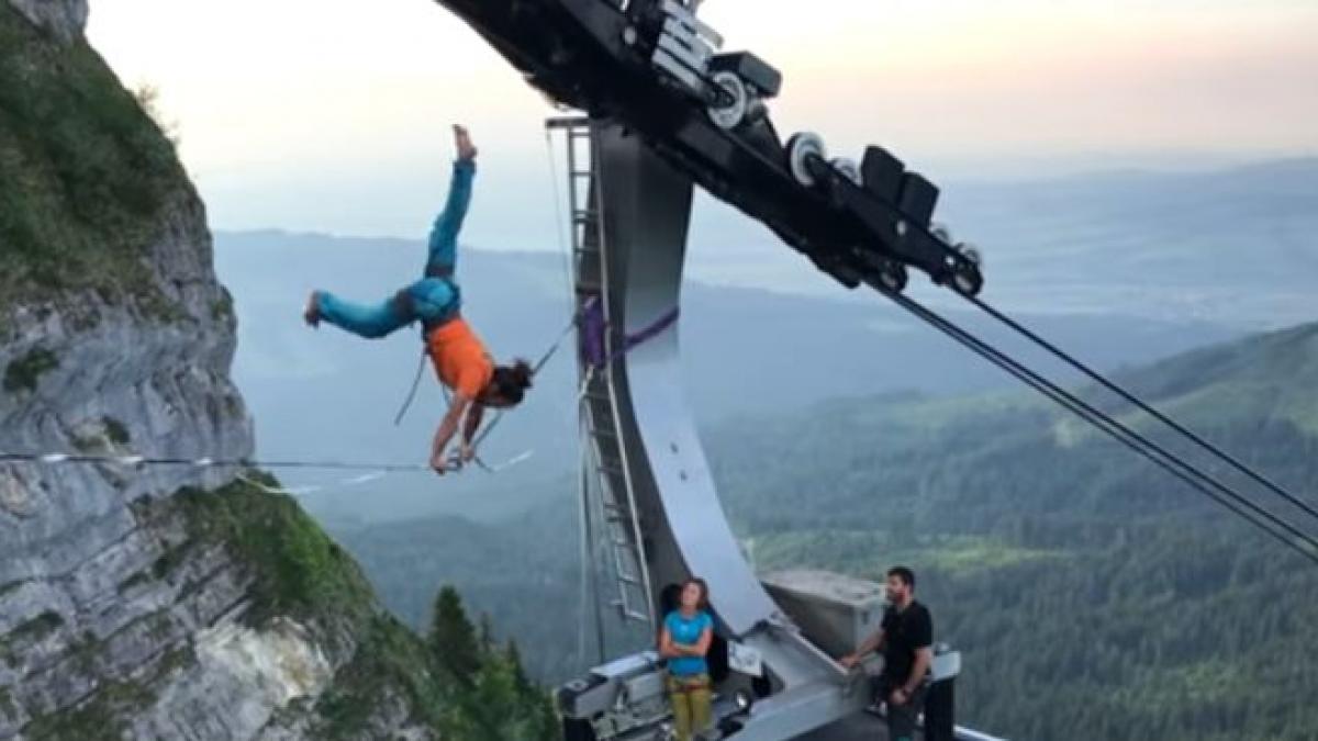 Francezul Samuel Volery a stat în mâini pe o frânghie suspendată între două telecabine.